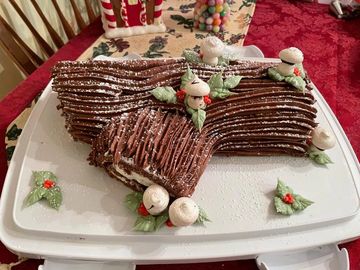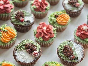 Chocolate sponge cake filled with vanilla buttercream icing and topped with chocolate buttercream icing. Frosting mushroom designs or flowers available.